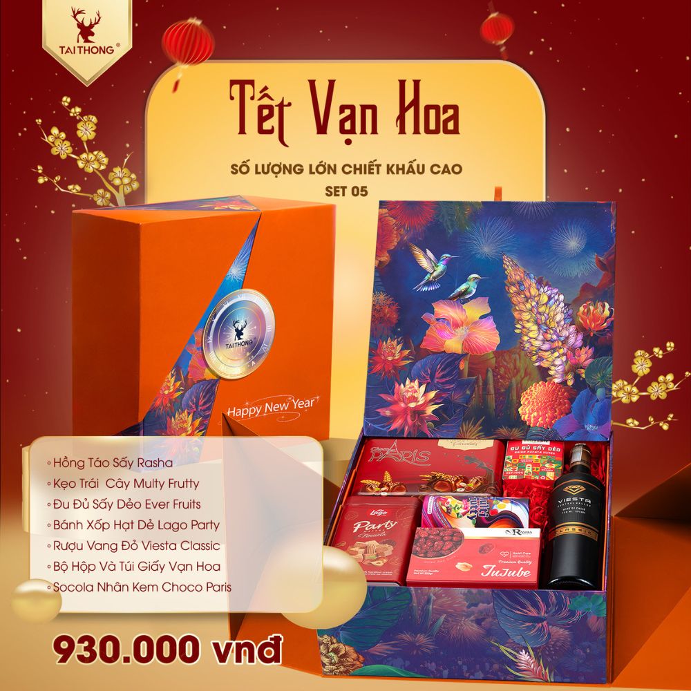 • Hộp quà Tết 2025: Vạn Hoa 04 bao gồm Multy Frutty, Ever Fruits, Choco Paris, Rasha, Lago Party, Viesta Classic