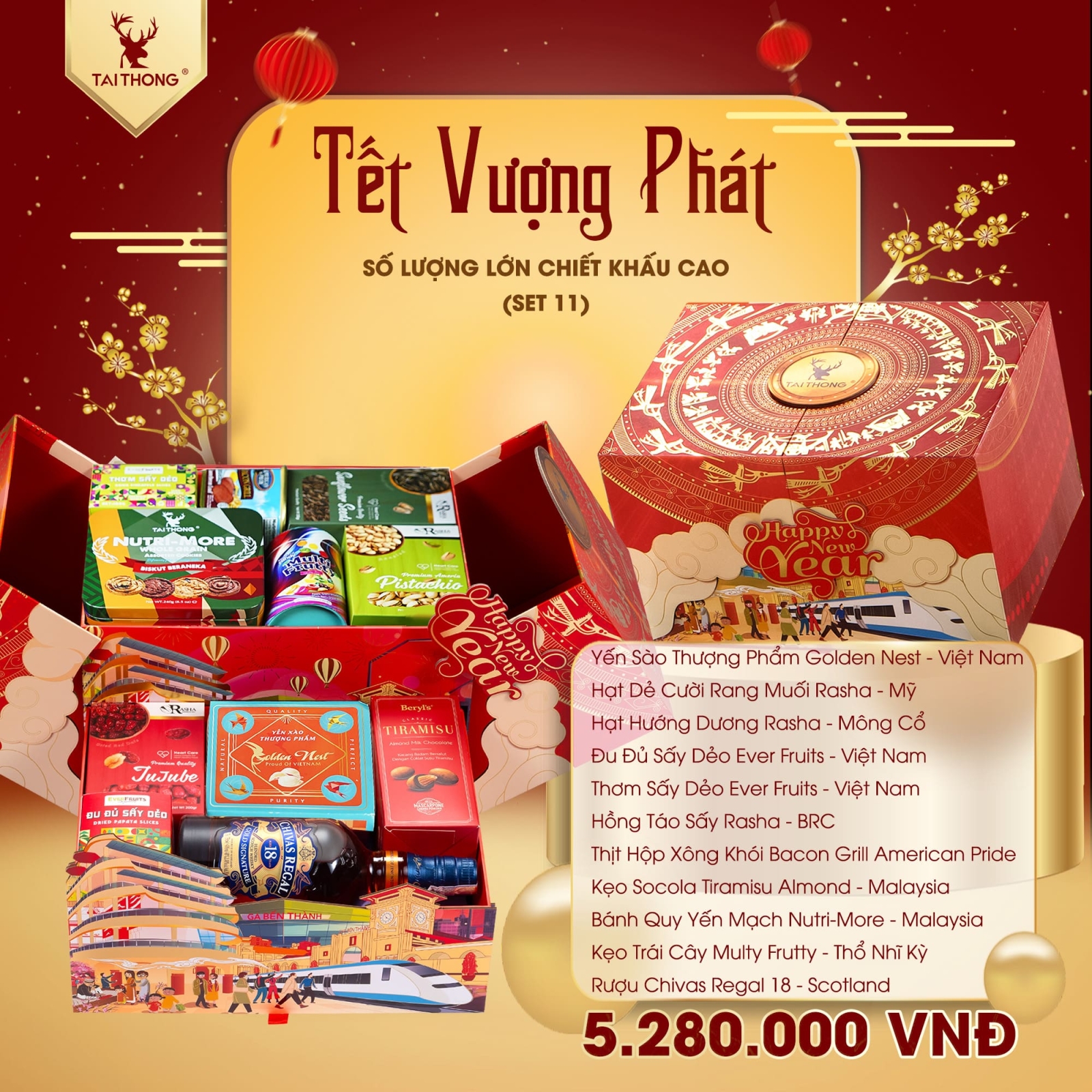 • Hộp quà Tết 2025: VP 11 bao gồm: Golden Nest, Rasha, Ever Fruits, Bacon Grill American Pride, Tiramisu Almond, Nutri-More, Multy Frutty, Chivas Regal 18