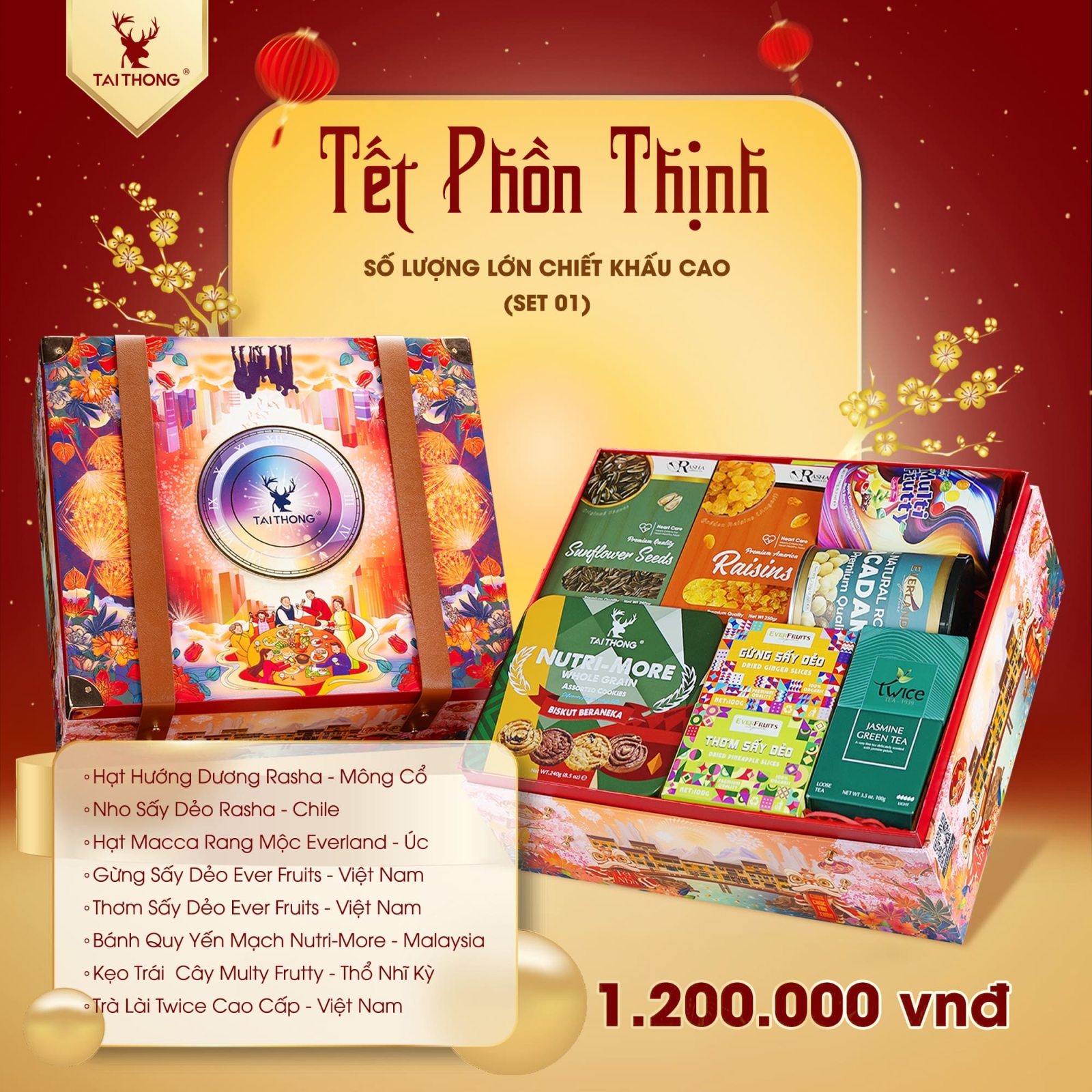 Hộp quà Tết 2025: VP 01 bao gồm: Rasha, Ever Fruits , Multy Frutty, Bristol, Nutri-More, Choco Paris, Twice, Feliso Reserva
