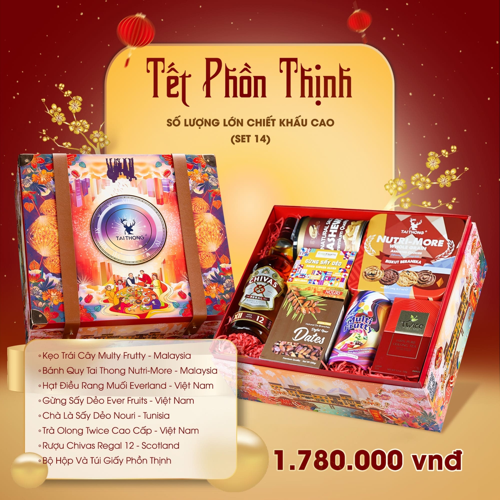 • Hộp quà Tết 2025: Phồn Thịnh 14 bao gồm Multy Frutty, Nutri-More, Everland, Ever Fruits, Nouri, Twice, Chivas Regal 12