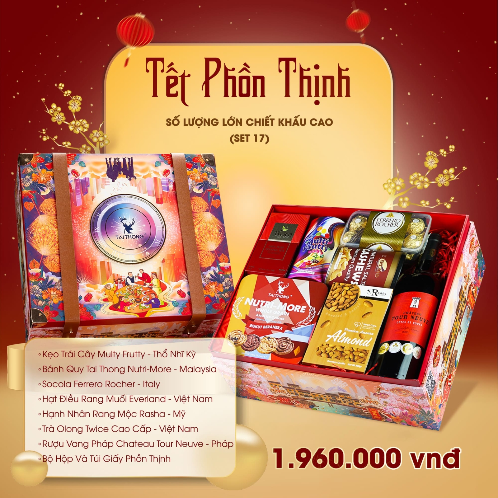 • Hộp quà Tết 2025: PT 17 bao gồm Multy Frutty, Nutri-More, Ferrero Rocher, Everland, Rasha, Twice, Chateau Tour Neuve