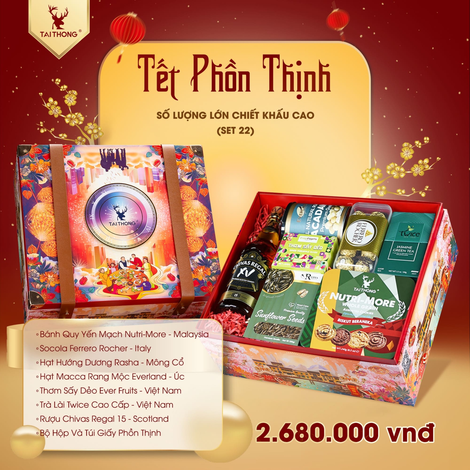 • Hộp quà Tết 2025: PT 22 bao gồm Nutri-More, Ferrero Rocher, Rasha, Everland, Ever Fruits, Twice, Chivas Regal 15