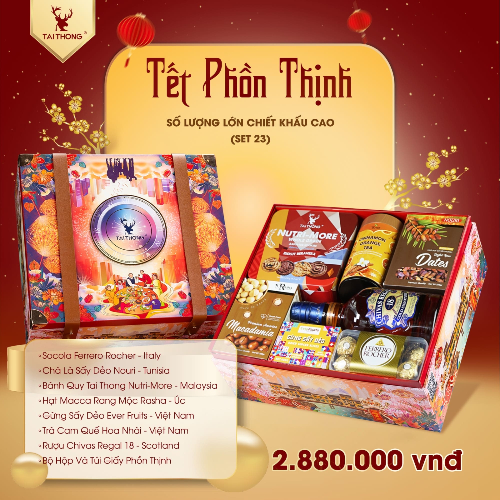 • Hộp quà Tết 2025: PT 23 bao gồm Ferrero Rocher, Nouri, Nutri-More, Rasha, Ever Fruits, Chivas Regal 18