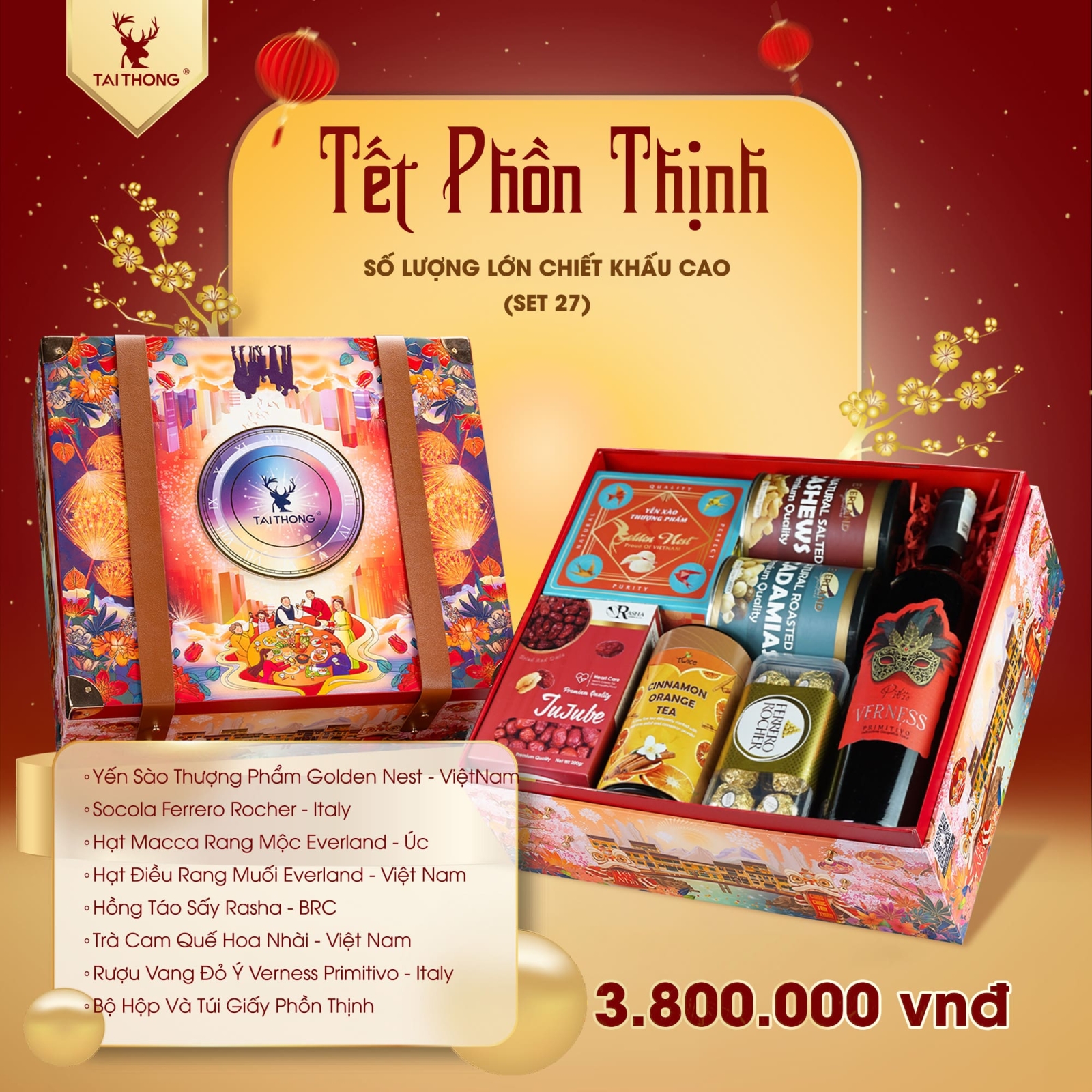 • Hộp quà Tết 2025: PT 27 bao gồm Golden Nest, Ferrero Rocher, Everland, Rasha, Twice, Verness Primitivo