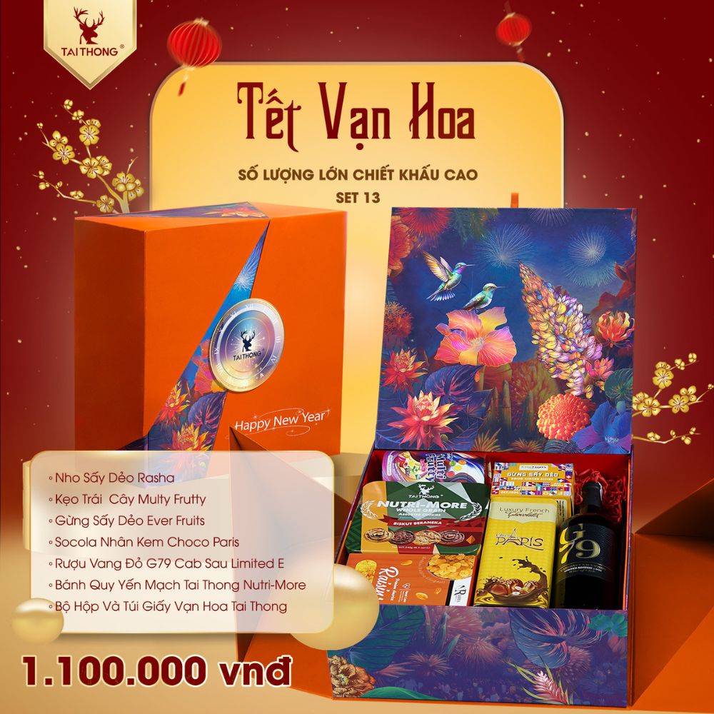 • Hộp quà Tết 2025: Vạn Hoa 12 bao gồm Multy Frutty, Choco Paris, Nutri-More, Rasha, Ever Fruits, G79 Cab Sau Limited E