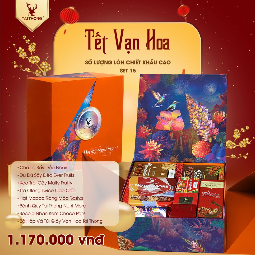 • Hộp Quà Tết 2025: Vạn Hoa 15 bao gồm Nouri, Rasha, Ever Fruits, Nutri-More, Multy Frutty, Twice, Choco Paris