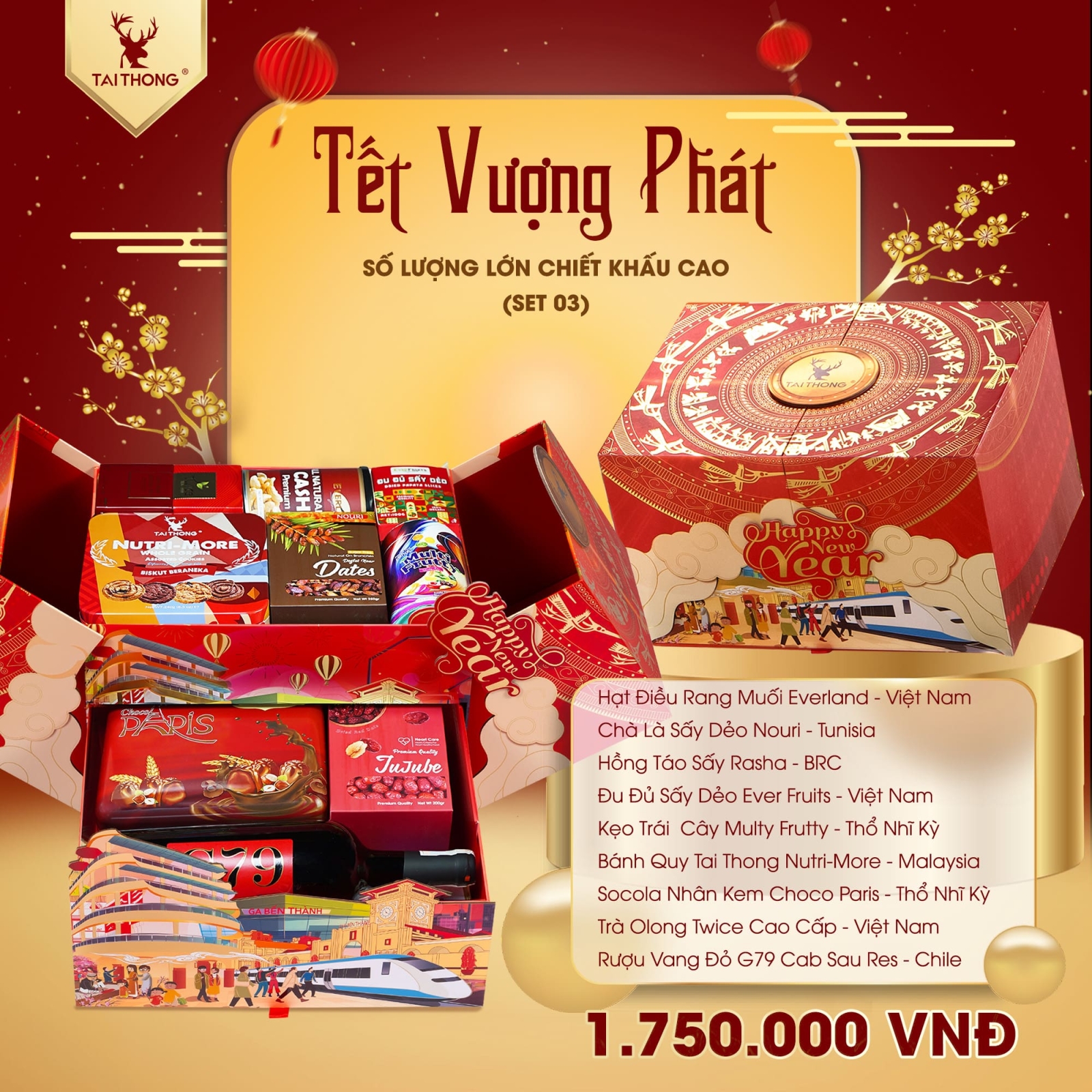 • Hộp quà Tết 2025: VP 03 bao gồm: Everland, Nouri, Rasha, Ever Fruits, Multy Frutty, Nutri-More, Choco Paris, Twice, G79 Cab Sau Res