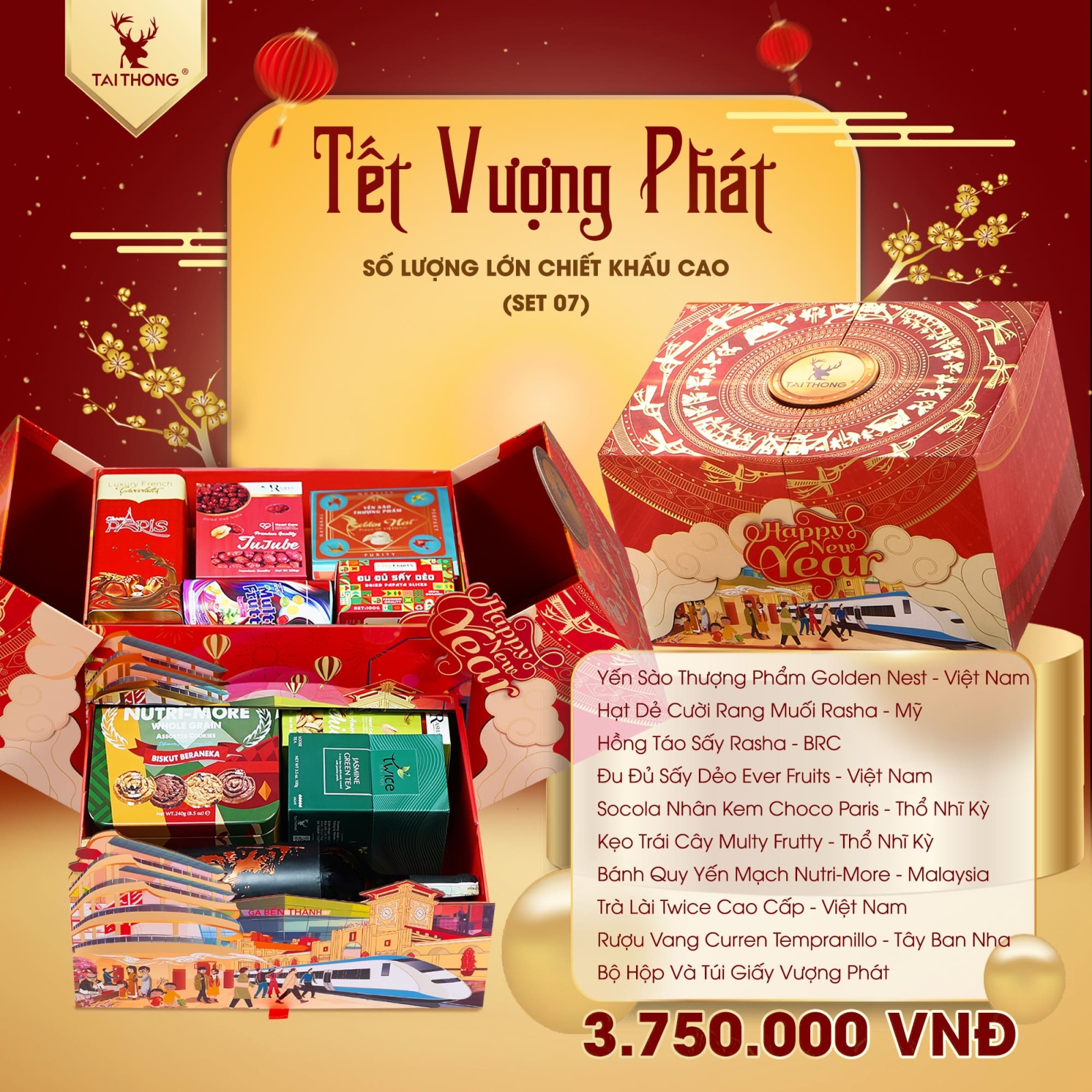 • Hộp quà Tết 2025: VP 07 bao gồm: Golden Nest, Rasha, Ever Fruits, Choco Paris, Multy Frutty, Nutri-More, Twice, Curren Tempranillo